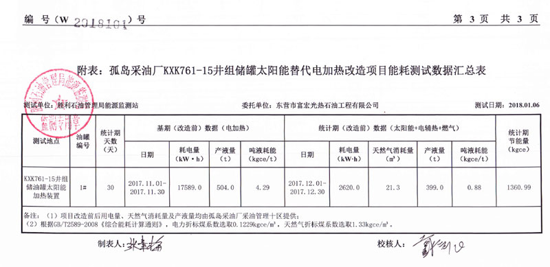 2017年11月20日,對(duì)勝利油田孤島采油廠采油管理十區(qū)的KXK761-15井組原油儲(chǔ)罐進(jìn)行光熱自控加熱裝置技術(shù)改造,改造前噸液加熱單耗4.38kgce/t,改造后噸液加熱單耗2.19kgce/t ,節(jié)能率49.9%。